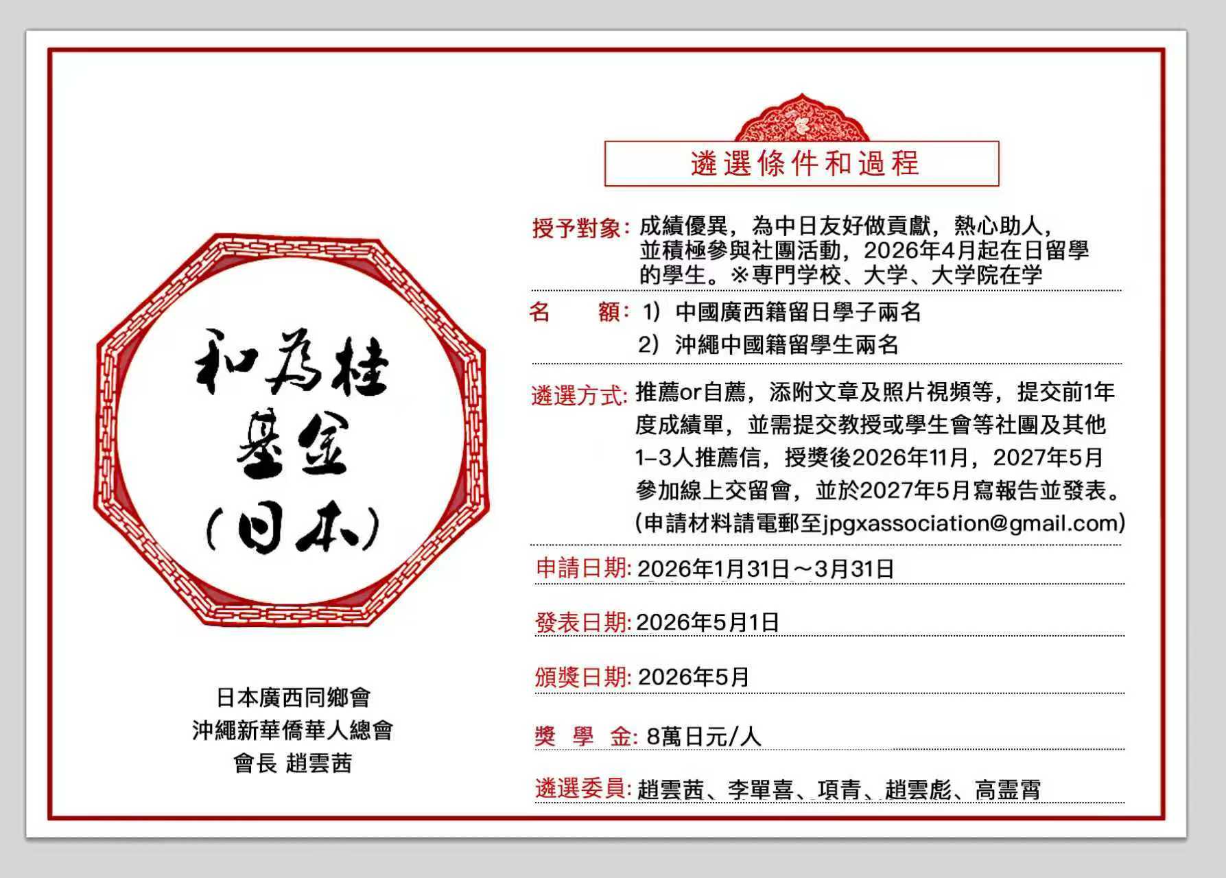 歡迎成績優異,為中日友好做貢獻,熱心助人,並積極參與社團活動,4月在日留學的廣西籍留學生,沖繩中國籍留學生踊跃報名。
